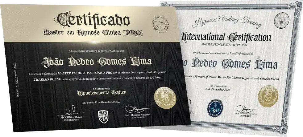 Você irá receber 5 certificações profissionais com reconhecimento mundial, emitidos pela Universidade Brasileira de Hipnose e pela HATC Hypnosis AcademyTraining Corporation dos Estados Unidos.